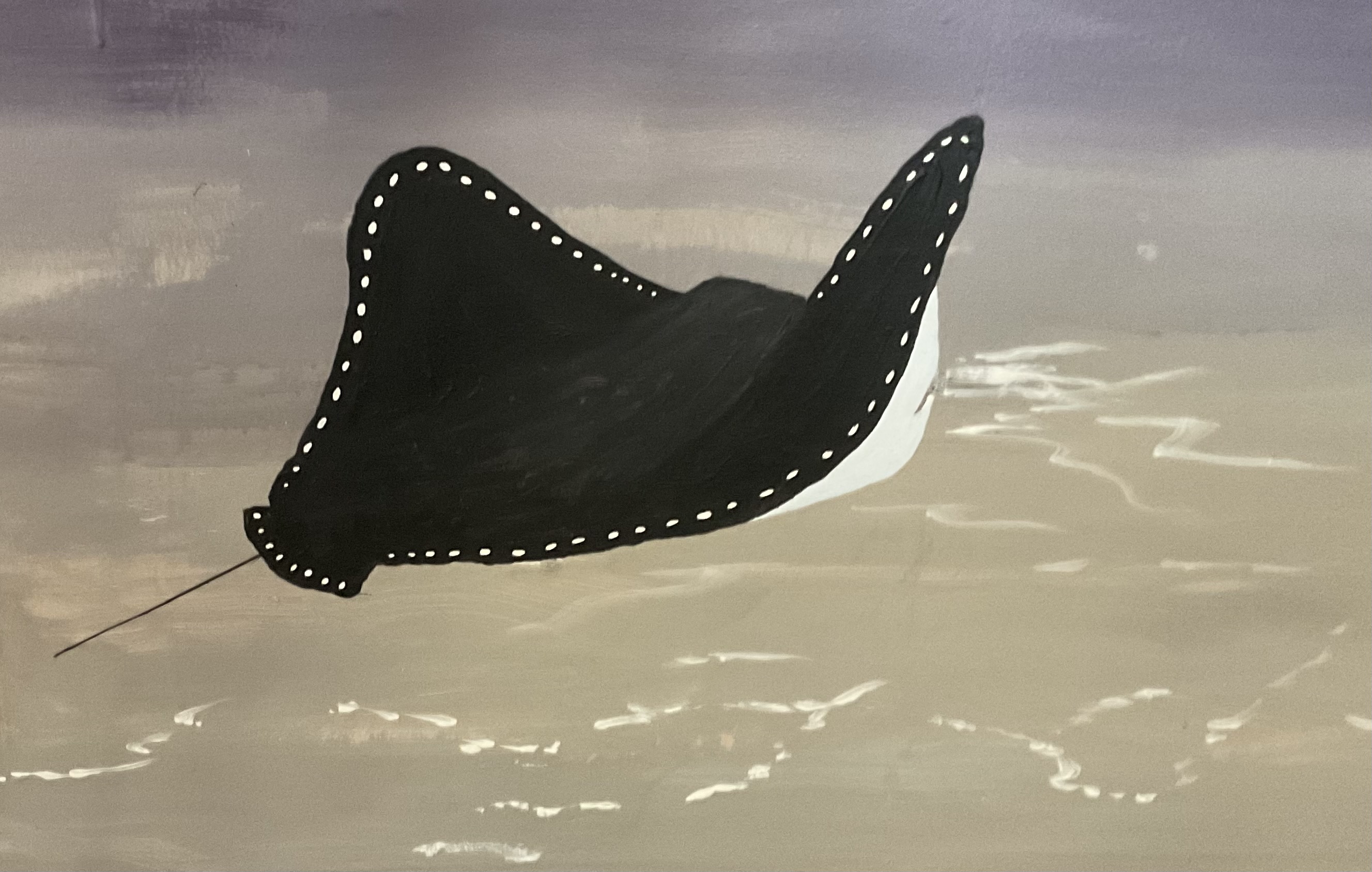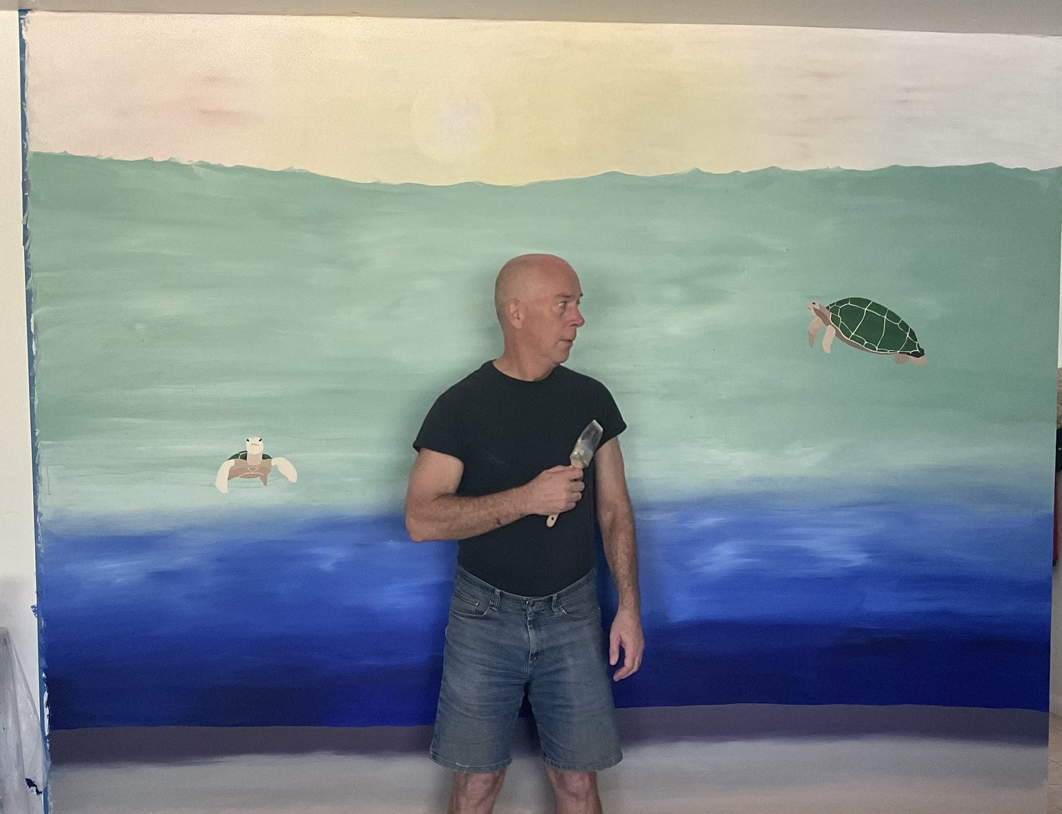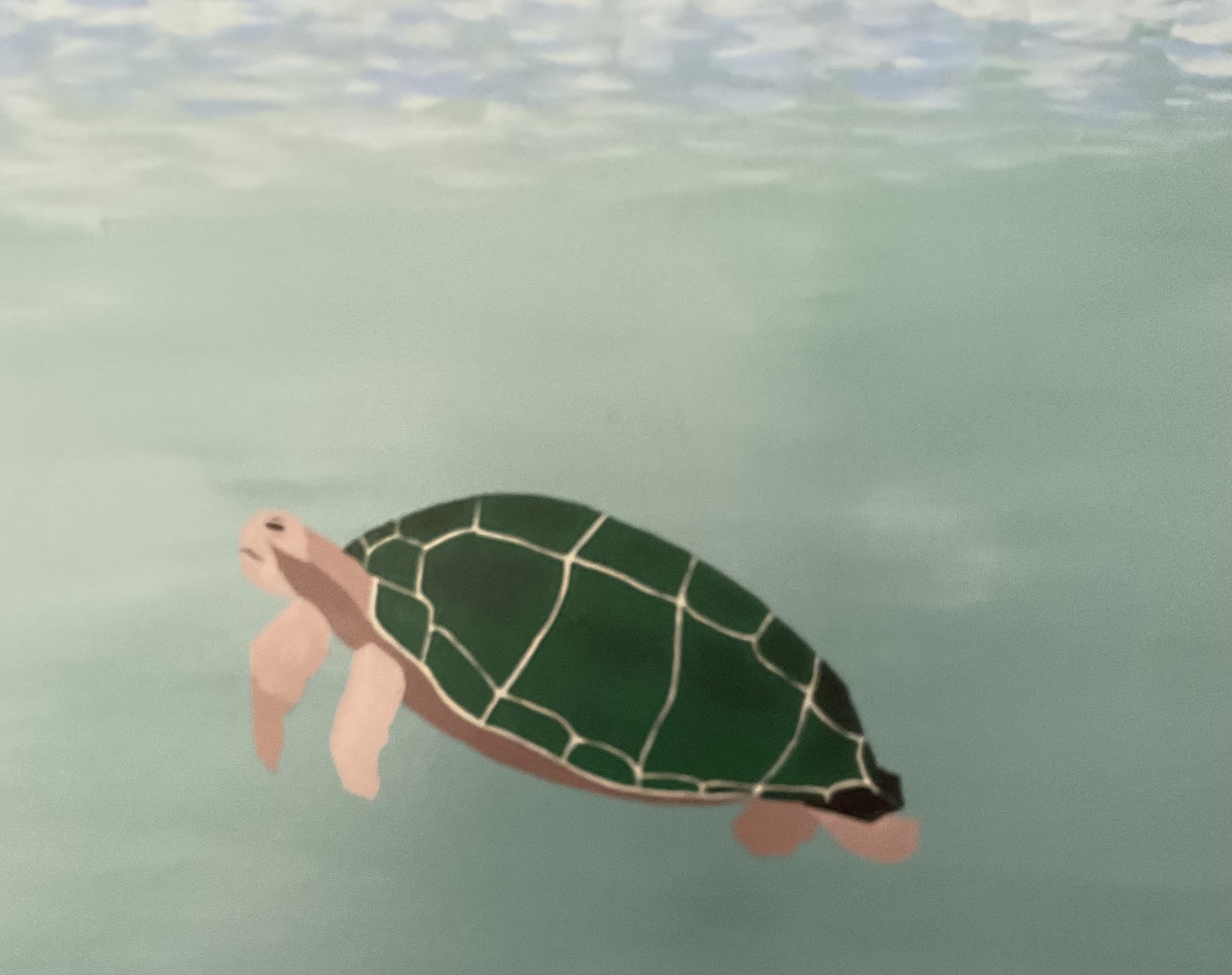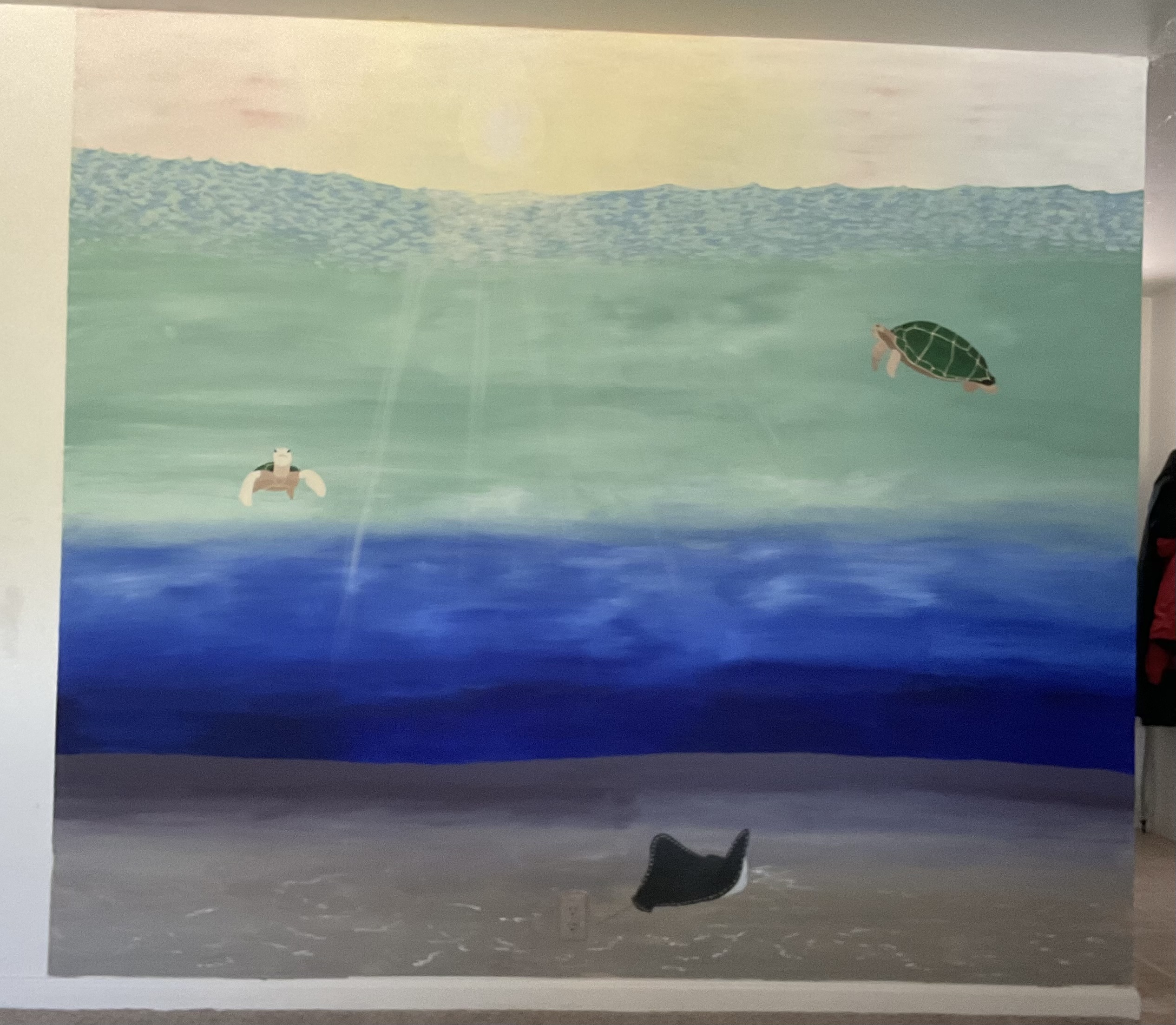 I had a couple prints hanging on my living/dining room wall. I've had the prints for years and I like them, but a few weeks back I decided to make a bold change. I moved the prints to the hallway and went to work on a big, 8 x 9, mural on that wall. Obviously it is an underwater scene, with a couple sea turtles and a manta ray. I really like it. It has a feeling of the vast open ocean, with a little bit of sea life.
